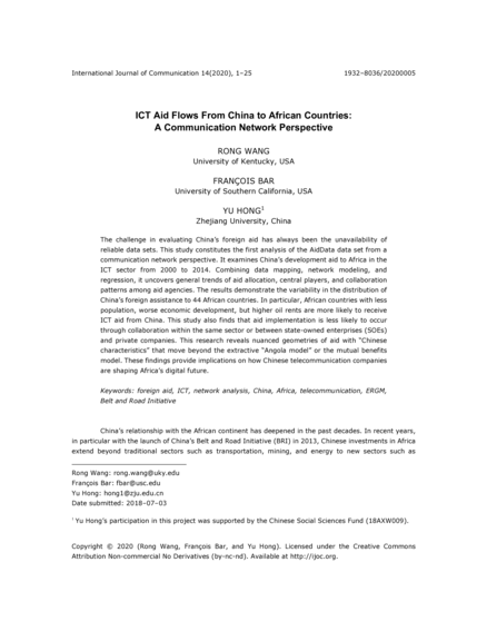 "The challenge in evaluating China’s foreign aid has always been the unavailability of reliable data sets. This study constitutes the first analysis of the AidData data set from a communication network perspective. It examines China’s development aid to Africa in the ICT sector from 2000 to 2014. Combining data mapping, network modeling, and regression, it uncovers general trends of aid allocation, central players, and collaboration patterns among aid agencies. The results demonstrate the variability in the distribution of China’s foreign assistance to 44 African countries. In particular, African countries with less population, worse economic development, but higher oil rents are more likely to receive ICT aid from China. This study also finds that aid implementation is less likely to occur through collaboration within the same sector or between state-owned enterprises (SOEs) and private companies. This research reveals nuanced geometries of aid with “Chinese characteristics” that move beyond the extractive “Angola model” or the mutual benefits model. These findings provide implications on how Chinese telecommunication companies are shaping Africa’s digital future." (Abstract)