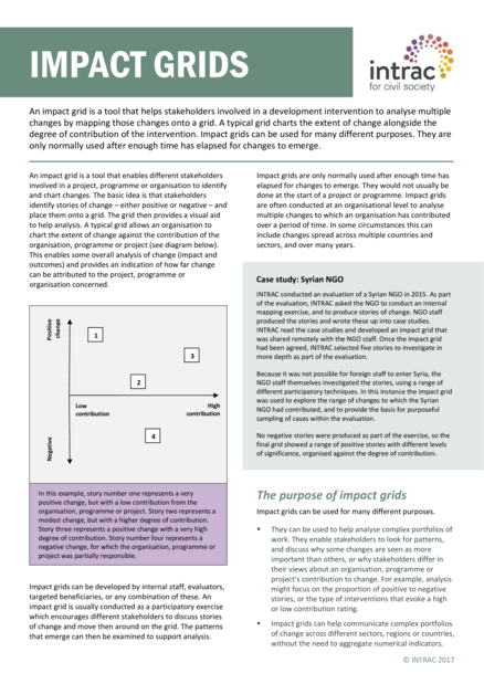 "An impact grid is a tool that helps stakeholders involved in a development intervention to analyse multiple changes by mapping those changes onto a grid. A typical grid charts the extent of change alongside the degree of contribution of the intervention. Impact grids can be used for many different purposes. They are only normally used after enough time has elapsed for changes to emerge." (Introduction)