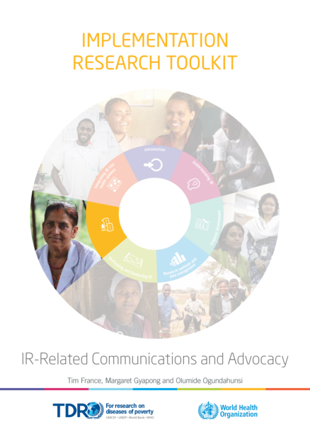 "Implementation Research (IR)-related communications and advocacy range from productive dialogue and engagement throughout research planning and implementation, through to translation and sharing of results through broad-based advocacy or awareness-raising materials, and ultimately to the uptake and integration of research conclusions into local, national or international policies and practices. This broad scope highlights how communications and advocacy take place at all stages of an IR project and comprise many kinds of specific communication approaches, including thought leadership, data visualization, mentoring, facilitation of proposal development and social media messaging, as well as and specific information products such as research reporting guidelines, peer-reviewed papers, press releases, web sites, meeting/conference presentations and policy briefs." (Page 1)