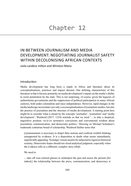 "Media development has long been a staple in Africa and literature about its conceptualisations, practices and impact abound. One defining characteristic of this literature is that it focuses primarily on media development’s impact on the media’s ability to resist penetration by the state. This chapter outlines a re-theorisation of ‘journalist’ and ‘media development’ within the African context. While the combination of new communication technologies and citizen journalism is bringing new voices, new experiences and novel information into the information ecosystem, more work is needed on the political economy of citizen journalism, particularly in light of the increasing corporatisation and centralisation of the internet. Africa and the rest of the Global South have seen an upsurge in funding from international donors and aid agencies directed at supporting free and independent media in developing and transitional countries." (Abstract)