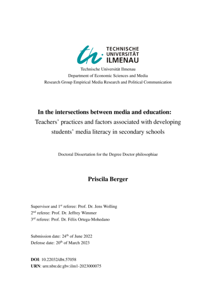 The first study approaches teachers’ role as media educators. This study explores the characteristics of students, schools, and countries that are associated with the incidence of learning computer and information competencies primarily from teachers. Therefore, data from 14 participant countries in the 2013 International Computer and Information Literacy Study were analyzed with a three-level regression model. The findings show that the most significant predictors are at the individual’s level, as gender, access to ICTs at home, parental socioeconomic conditions, and self-efficacy concerning ICT yield positive associations with recognizing teachers as primary digital mentors. The schools’ characteristics do not show significant associations. At the country level, ICT Development Index associates negatively and significantly with students’ relying on teachers to develop computer and information competencies.