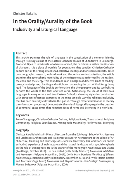 "This article examines the role of language in the constitution of a common identity through its liturgical use at the Eastern Orthodox church of St Andrew’s in Edinburgh, Scotland. Open to individuals who have relocated, the parish has a rather multinational character. It is a place of worship for populations that consider Christian Orthodox culture part of their long-established collective identity and for recent converts. Based on ethnographic research, archival work and theoretical contextualisation, the article examines the atmospheric materiality of the written text as performed by the readers, the choir and the clergy. This soundscape is an amalgam of different kinds of reading: prose, chanted prose, chanting and antiphonic, depending the part of the Liturgy being read. The language of the book is performative: the choreography and its symbolisms perform the words of the texts and vice versa. Additionally, the use of at least four languages in every service and two Eastern Orthodox chanting styles in combination with European influences expresses in the most tangible way the religious inclusivity that has been carefully cultivated in this parish. Through closer examination of literary transformation processes, I demonstrate the role of liturgical language in the creation of communal space-times that negotiate ideas of home and belonging in a new land." (Abstract)