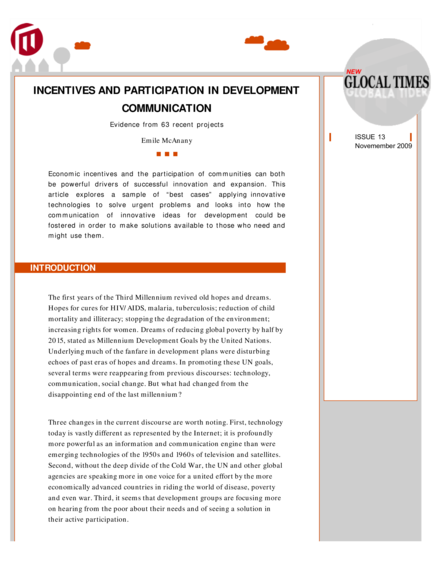 "Economic incentives and the participation of communities can both be powerful drivers of successful innovation and expansion. This article explores a sample of “best cases” applying innovative technologies to solve urgent problems and looks into how the communication of innovative ideas for development could be fostered in order to make solutions available to those who need and might use them." (Abstract)