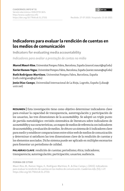 "Esta investigación tiene como objetivo determinar indicadores clave para evaluar la capacidad de transparencia, autorregulación y participación de los usuarios, las tres dimensiones de la accountability. Se adoptó un triple punto de partida metodológico: revisión sistemática de literatura sobre indicadores de accountability y sus características, un mapeo de medios de referencia con indicadores de accountability, y evaluación de medios. Se obtuvo un sistema de 11 indicadores clave para medir y establecer comparaciones entre sitios web de medios de comunicación y determinar si satisfacen las tres dimensiones clave de la rendición de cuentas y los elementos asociados. Dicho sistema puede ser aplicado en múltiples escenarios para fomentar un periodismo de calidad." (Resumen)
