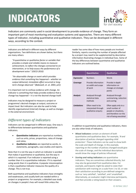 "Indicators are commonly used in social development to provide evidence of change. They form an important part of most monitoring and evaluation systems and approaches. There are many different types of indicator, including quantitative and qualitative indicators. They can be developed in different ways, according to the context." (Introduction)