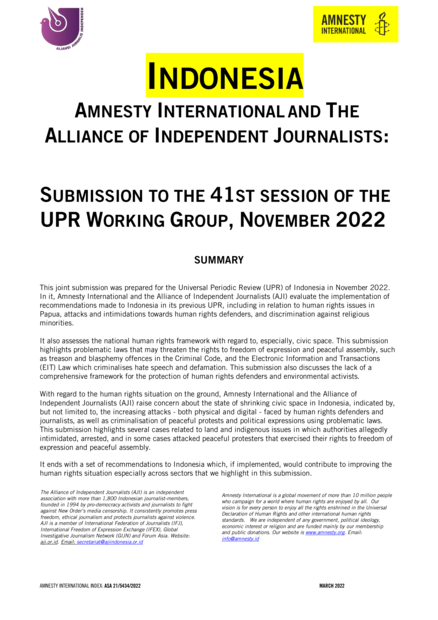 "This joint submission was prepared for the Universal Periodic Review (UPR) of Indonesia in November 2022. In it, Amnesty International and the Alliance of Independent Journalists (AJI) evaluate the implementation of recommendations made to Indonesia in its previous UPR, including in relation to human rights issues in Papua, attacks and intimidations towards human rights defenders, and discrimination against religious minorities. It also assesses the national human rights framework with regard to, especially, civic space. This submission highlights problematic laws that may threaten the rights to freedom of expression and peaceful assembly, such as treason and blasphemy offences in the Criminal Code, and the Electronic Information and Transactions (EIT) Law which criminalises hate speech and defamation. This submission also discusses the lack of a comprehensive framework for the protection of human rights defenders and environmental activists. With regard to the human rights situation on the ground, Amnesty International and the Alliance of Independent Journalists (AJI) raise concern about the state of shrinking civic space in Indonesia, indicated by, but not limited to, the increasing attacks - both physical and digital - faced by human rights defenders and journalists, as well as criminalisation of peaceful protests and political expressions using problematic laws." (Summary)