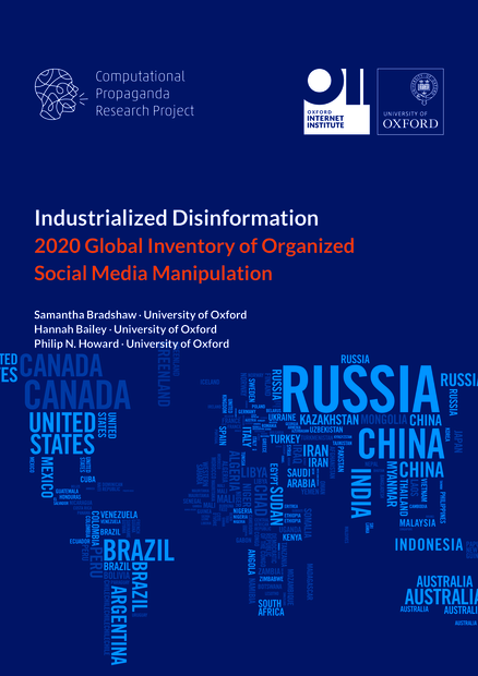 "Our 2020 report highlights the recent trends of computational propaganda across 81 countries and the evolving tools, capacities, strategies, and resources used to manipulate public opinion around the globe. We identify three key trends in this year’s inventory of disinformation activity: 1. Cyber troop activity continues to increase around the world. This year, we found evidence of 81 countries using social media to spread computational propaganda and disinformation about politics. This has increased from last years’ report, in which we identified 70 countries with cyber troop activity. 2. Over the last year, social media firms have taken important steps to combat the misuse of their platforms by cyber troops. Public announcements by Facebook and Twitter between January 2019 and November 2020 reveal that more than 317,000 accounts and pages have been removed by the platforms. Nonetheless, almost US $10 million has still been spent on political advertisements by cyber troops operating around the world. 3. Private firms increasingly provide manipulation campaigns. In our 2020 report, we found firms operating in forty-eight countries, deploying computational propaganda on behalf of a political actor. Since 2018 there have been more than 65 firms offering computational propaganda as a service. In total, we have found almost US $60 million was spent on hiring these firms since 2009." (Executive summary)
