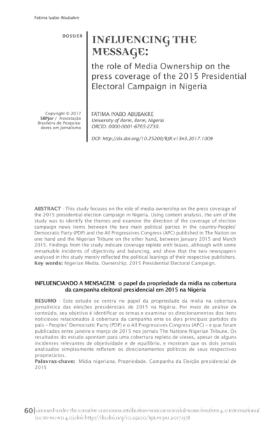 "This study focuses on the role of media ownership on the press coverage of the 2015 presidential election campaign in Nigeria. Using content analysis, the aim of the study was to identify the themes and examine the direction of the coverage of election campaign news items between the two main political parties in the country-Peoples’ Democratic Party (PDP) and the All Progressives Congress (APC) published in The Nation on one hand and the Nigerian Tribune on the other hand, between January 2015 and March 2015. Findings from the study indicate coverage replete with biases, although with some remarkable incidents of objectivity and balancing, and show that the two newspapers analysed in this study merely reflected the political leanings of their respective publishers." (Abstract)