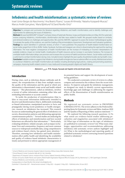 "Our search identified 31 systematic reviews, of which 17 were published. The proportion of health-related misinformation on social media ranged from 0.2% to 28.8%. Twitter, Facebook, YouTube and Instagram are critical in disseminating the rapid and far-reaching information. The most negative consequences of health misinformation are the increase of misleading or incorrect interpretations of available evidence, impact on mental health, misallocation of health resources and an increase in vaccination hesitancy. The increase of unreliable health information delays care provision and increases the occurrence of hateful and divisive rhetoric. Social media could also be a useful tool to combat misinformation during crises. Included reviews highlight the poor quality of published studies during health crises. Conclusion: Available evidence suggests that infodemics during health emergencies have an adverse effect on society. Multisectoral actions to counteract infodemics and health misinformation are needed, including developing legal policies, creating and promoting awareness campaigns, improving health-related content in mass media and increasing people’s digital and health literacy." (Abstract)