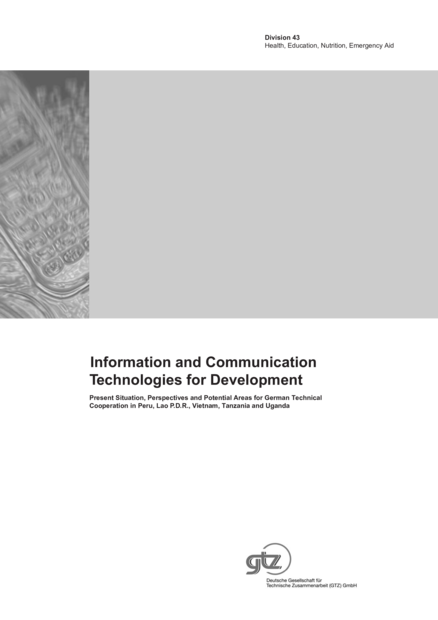 "The overall objective of this study was to provide a starting point for the involvement of development assistance in the promotion of ICTs for development. In the form of country studies we first tried to give insights into the ICT sectors along with stakeholders’ and other ICT-related activities in the selected countries (Peru, Vietnam, Lao P.D.R, Uganda and Tanzania). Based on this assessment, strengths and weaknesses were named and starting points for potential German involvement identified. The following section should point at some general lessons learnt from all countries and, with due caution, sum up the activities and discussions on the German donors’ side, as they emerged in the countries themselves or in discussions while this study was conducted." (Synopsis, page 67)
