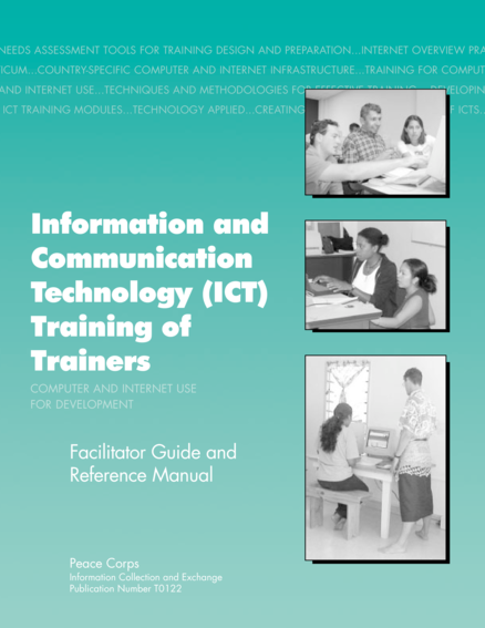 "This Facilitator Guide and Reference Manual is to be used when training Volunteers and others who will serve as trainers in information and communication technology (ICT) during Volunteers’ Pre-Service Training (PST) or In-Service Training (IST). It outlines the format, materials, objectives, time, sequence, and content of the training of trainers (TOT). While this TOT is designed to prepare participants to conduct formal training sessions, the skills and materials can be applied to one-on-one situations or workshops designed to occur over several weeks or months that incorporate short skill-building sessions. The accompanying Participant Handbook is to be distributed to all trainers and participants." (Introduction)