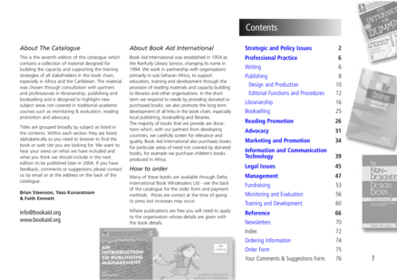 "The seventh edition of a very useful and attractively presented catalogue, which contains a collection of resources designed for building the capacity and supporting the training strategies of all stakeholders in the book chain, especially in Africa and the Caribbean. The material was chosen through consultation with partners and professionals in librarianship, publishing and bookselling, and is designed to highlight new subject areas not covered in traditional academic courses, such as monitoring and evaluation, reading promotion and advocacy. Titles are grouped broadly by subject areas including writing, design and production, editorial functions and procedures, librarianship, bookselling, marketing and promotion, management, legal issues, reference, and the catalogue also offers a range of resources on ICT and the Internet." (Hans M. Zell, Publishing, Books & Reading in Sub-Saharan Africa, 3d ed. 2008, nr. 2450)