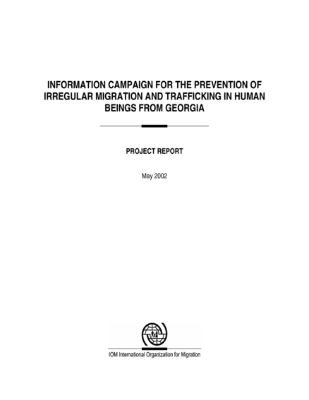 "The information campaign that IOM Tbilisi is implementing in Georgia during the year 2002 aims at preventing irregular migration and trafficking in human beings from Georgia. IOM will seek to raise the awareness of potential irregular migrants of the pitfalls of irregular migration and to alert them about the inherent dangers in trafficking. This information will give potential migrants a more realistic picture of possibilities for regular migration and help them to counterbalance misperceptions and deliberately misleading information. IOM conducts the information campaign in the framework of the “Cluster” process, which is an ongoing dialogue on irregular migration between countries of origin in the South Caucasus and those of destination in Western Europe." (Executive summary)