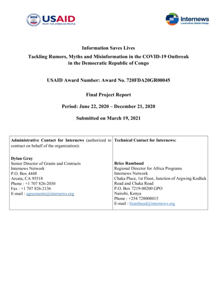 "In the Eastern DRC where the 10th Ebola epidemic was coming to an end, the advent of COVID-19 raised additional concern of dealing with two major health emergencies at the same time with implications for effective audience engagement, and compliance to public health measures. These concerns came against the backdrop of audience fatigue with Ebola programming and a seeming lack of trust in the Ebola response – seen by some members of the public as a money-making venture. Similar concern and mistrust are also expressed with the COVID-19 response. Given this, Internews secured funding from BHA/USAID to respond to the growing rumors and misinformation about COVID-19 and provide life-saving information to audiences. By working with local radio partners, Internews produced 23 radio programs and several Public Service Announcements that were aired over 14,000 times on 39 partner stations. This is in addition to expanding its rumor tracking to address community concerns on COVID-19 and building partner capacity on fact-checking and radio programming. In a Knowledge, Attitude and Practice (KAP) survey conducted in December last year, 72% respondents cited Internews radio program, Tushinde Corona for improving their knowledge about COVID-19 and 74% credited it for changing certain behaviors and practices that include regular handwashing and use of facemask. While these are notable developments, challenges remain, particularly with the acceptance of and willingness to take COVID-19 vaccine, thus generating heated public debate. The government recently suspended vaccines delivered through the COVAX Facility citing safety concerns thus adding to existing rumors about the efficacy and reliability of COVID-19 vaccines. In the December KAP survey conducted by Internews, only 49% of respondents said they would take a COVID-19 vaccine or recommend it to someone - a figure that is similar to the 46% who said the same in a GeoPoll 2020 report on COVID-19 that focused on six countries including the DRC." (Executive summary)