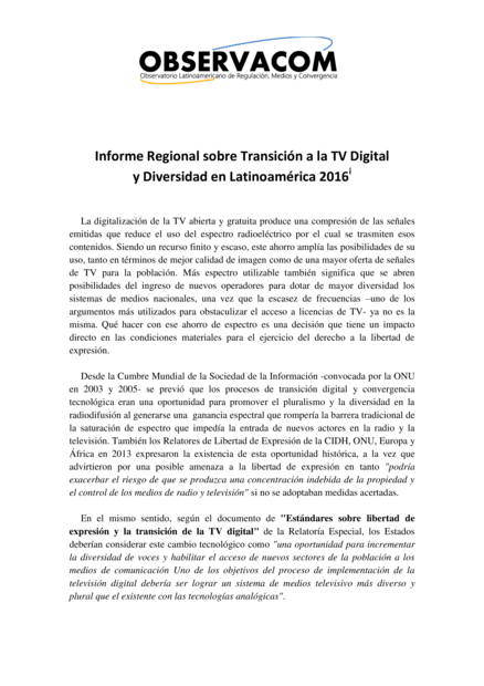 Informe Regional sobre Transición a la TV Digital y Diversidad en Latinoamérica 2016