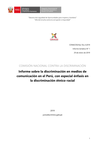 "El presente informe aborda la problemática de los contenidos discriminatorios difundidos a través de los medios de comunicación en el Perú, con especial énfasis en la discriminación étnico-racial a través de los programas de radio y televisión, así como de medios escritos, a la luz de los compromisos que plantea el Derecho Internacional de los Derechos Humanos, de la jurisprudencia interamericana, constitucional y la doctrina más reciente sobre la materia. El objetivo de este análisis es establecer una agenda de compromisos a nivel de políticas públicas y desarrollos normativos que permitan revertir la problemática identificada." (Resumen ejecutivo, página 4)