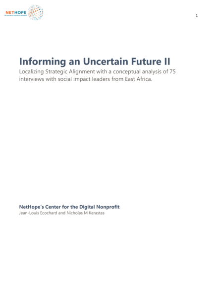 "This whitepaper establishes that there is misalignment on the implementation of digital enabling strategies between global headquarters and the local humanitarian and development programs of East Africa. As headquarters of international NGOs – mostly based in the global north – participate in an information revolution that seeks to drive organizational efficiency (i.e., Peak Performance) through effective data use (i.e., Information Certainty) local humanitarian impact programs – mostly based in the global south – have not been afforded the equivalent digital foundation to join the information revolution on their owns terms. Consequently, when seeking to leverage business applications and digitally enabled services for amplified impact there exist fundamental barriers to success. To unlock gridlock around the amplifying potential of digital, global nonprofits must revisit foundational digital dimensions thereby finishing the job on “wiring [and connecting] the global village” (Granger-Happ, 2001), providing skills and leadership for a digital age, and ensuring that collective action is harnessed in a strategic capacity to scale innovation in parallel with sector trends of localization." (Astract)