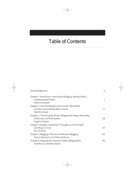"Through case studies of blogs written in English, Chinese, Arab, French, Russian, and Hebrew, this book explores the way blogging is being conceptualized in different cultural contexts. The authors move beyond the most highly trafficked sites to shed light on larger developments taking place online, calling into question assumptions that form the foundation of much of what we read on blogging and, by extension, on global amateur or do-it-yourself media. This book suggests a more nuanced approach to understanding how blogospheres serve communication needs, how they exist in relation to one another, where they exist apart as well as where they overlap, and how they interact with other forms of communication in the larger media landscape." (Publisher description)