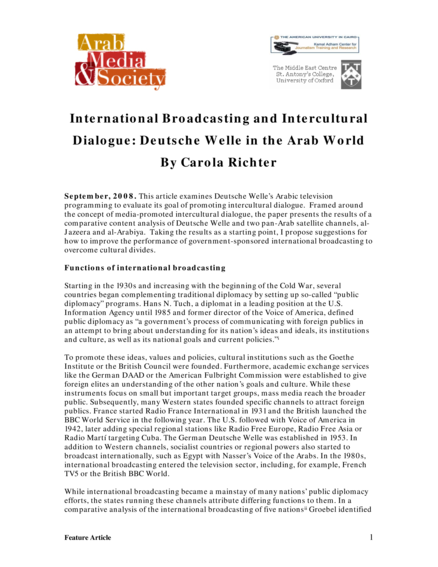 "This article examines Deutsche Welle's Arabic television programming to evaluate its goal of promoting intercultural dialogue. Framed around the concept of media-promoted intercultural dialogue, the paper presents the results of a comparative content analysis of Deutsche Welle and two pan-Arab satellite channels, al-Jazeera and al-Arabiya. Taking the results as a starting point, I propose suggestions for how to improve the performance of government-sponsored international broadcasting to overcome cultural divides." (Introduction)