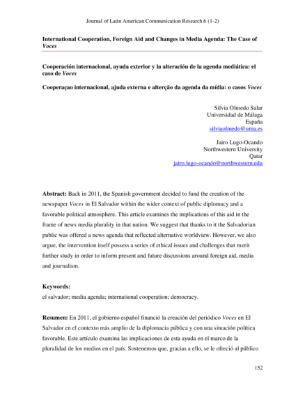 "Back in 2011, the Spanish government decided to fund the creation of the newspaper Voces in El Salvador within the wider context of public diplomacy and a favorable political atmosphere. This article examines the implications of this aid in the frame of news media plurality in that nation. We suggest that thanks to it the Salvadorian public was offered a news agenda that reflected alternative worldview. However, we also argue, the intervention itself possess a series of ethical issues and challenges that merit further study in order to inform present and future discussions around foreign aid, media and journalism." (Abstract)
