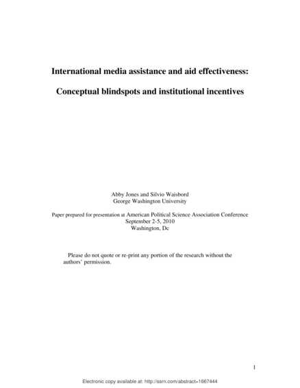 "This article analyzes how selected programs articulate broad media objectives with program goals and apply indicators to determine impact with the goal of understanding how media assistance goals are operationalized and measured, and how program goals are linked to broad objectives. Guided by the notion that institutions and institutional incentives matter in international aid, it is proposed that IMA program goals should not only be the reflection of normative arguments about desirable media structures and practices, and models of development and change. They also need to be viewed as the expression of the dynamics and organizational goals of aid institutions." (Abstract)