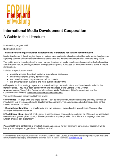 "This guide aims to bring together the most relevant literature on media development cooperation, both of practical and academic nature, and regardless of ideological background. It focuses on the role of external actors in media development. Included are publications which explicitly address the role of foreign or international assistance; coherently handle a clearly defined issue; are based on major programmes or various projects; are or were publicly available and were published after 1990. 485 reports, toolkits, strategy papers and academic writings met such criteria and have been included in this literature guide. They have been selected from the databases of the Catholic Media Council (CAMECO), the Center for International Media Assistance (CIMA) and the Communication Initiative. The publications are categorised in three levels: 60 core titles – in large print and single column – can be considered fundamental reading and may serve as an introduction to a given area of media development cooperation. The commentaries briefly indicate their central theses, results or proposals. 100 complementary titles – in smaller print and two columns – expand on the given theme. They are also accompanied by commentaries. 325 additional titles – in small print – cover a specific aspect or case study, and may be of interest for specialised research on a given topic or country. Short explanations may be provided if the title is in a language other than English or is not self-explanatory." (Page 1)