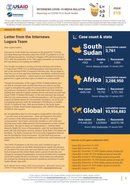 "Internews in South Sudan has now been on the ground for 7 months, providing lifesaving information about the COVID-19 pandemic to at risk and affected populations, including to refugees, IDPs and those living in PoCs. With the publication of our 10th Lugara newsletter we would like to first say thank you for reading our bulletins! Even though our project is coming to an end, Internews will continue to mainstream COVID-19 in to existing programs and interventions as part of the national COVID-19 response transition plan. We are eager to hear from you on how any future Internews newsletters could best serve communities and partners – please send us your feedback on what you gained from Lugara and other topics of interest we could consider. Through the publication of the Lugara COVID-19 Media bulletins (you can find an overview of all our published resources below), we have sought to strengthen the quality of communications around COVID-19 and response mechanisms. We have collaborated with local media by building their capacity to gather, analyze, assess, and report accurate and timely COVID-19 related information." (Page 1)