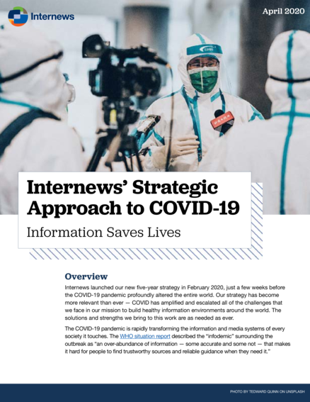 "The Internews approach to addressing COVID-19 is deeply rooted in our new strategy, which calls for building the five elements of a healthy information environment. These are: 1. Good, accurate, evidence-based information; 2. That everyone can access safely; 3. That consumers know how to critically assess; 4. That is valued by communities and sustained by business models that work; and 5. Where governments and businesses are accountable for keeping it that way." (Page 3)