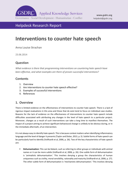 "A number of international organisations and NGOs suggest strategies for countering hate speech, but there is limited evidence of successful interventions. There is a general lack of impact evaluations of interventions to counter hate speech. When impact is measured it tends to be done in the short-term, for example by looking at feedback from individuals involved in conferences, rather than measuring behavioural change or changes in attitudes. Moreover, claims about the impact of specific interventions are often made by the organisations running the interventions and are unsubstantiated." (Page 3)