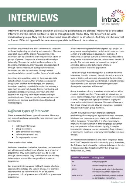 "Interviews are routinely carried out when projects and programmes are planned, monitored or evaluated. Interviews may be carried out face-to-face or through remote media. They may be carried out with individuals or groups. They may be unstructured, semi-structured or structured. And they may be informal or formal. Different types of interviews are appropriate in different circumstances." (Introduction)
