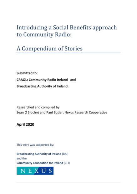 "What really differentiates community media from their local commercial counterparts is that they see themselves, from their foundation, as part of the community. They do not just serve the community, or reflect the interests of the community, they engage directly with the community and the community engages directly with them – they are inseparable. It is not just about capturing the attention of listeners, it is about listening to the community, being part of the community by engaging in activities, amplifying the voices of diverse groups in the community, opening a space for volunteers to take part directly and indeed to manage and run the station. Most of all it is about contributing to the overall social benefit of the community, as part of and engaging with the wider local empowerment and development infrastructure. The bulk of this document comprises, in the long Annex, a diverse set of stories that describe, concretely, how the community and community stations interacting, in ways that benefit individuals and groups locally, and ultimately the community as a whole." (Page 1)