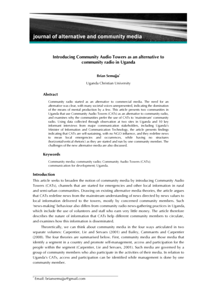 "This article presents two communities in Uganda that use Community Audio Towers (CATs) as an alternative to community radio, and examines why the communities prefer the use of CATs to ‘mainstream’ community radio. Using data collected through observation at two sites in Uganda and 10 key informant interviews from major communication stakeholders, including Uganda’s Minister of Information and Communication Technology, the article presents findings indicating that CATs are self-sustaining, with no NGO influence, and they redefine news to mean local emergencies and occurrences, while having no structures (horizontal/vertical rhetoric) as they are started and run by one community member. The challenges of the new alternative media are also discussed." (Abstract)