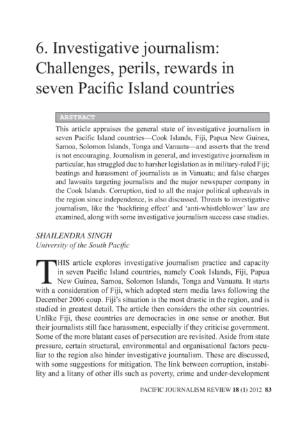 "This article appraises the general state of investigative journalism in seven Pacific Island countries—Cook Islands, Fiji, Papua New Guinea, Samoa, Solomon Islands, Tonga and Vanuatu—and asserts that the trend is not encouraging. Journalism in general, and investigative journalism in particular, has struggled due to harsher legislation as in military-ruled Fiji; beatings and harassment of journalists as in Vanuatu; and false charges and lawsuits targeting journalists and the major newspaper company in the Cook Islands. Corruption, tied to all the major political upheavals in the region since independence, is also discussed. Threats to investigative journalism, like the ‘backfiring effect’ and ‘anti-whistleblower’ law are examined, along with some investigative journalism success case studies." (Abstract)