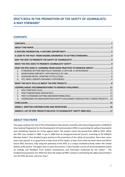 "The IPDC has played a significant role in the promotion of the safety of journalists in recent years, contributing to and building on the momentum around journalists’ safety issues. However, developing a specific IPDC strategy with the aim of maintaining the momentum, and making full use of its potential, will be important for the IPDC to ensure its continued relevance in addressing this critical challenge to freedom of expression and freedom of the press. This strategy needs to focus on those goals that the IPDC is better placed to achieve than any other entity, while complementing UNESCO’s other work in this area. This would increase IPDC impact, on the one hand, and the interest among donors, on the other." (Page 15)