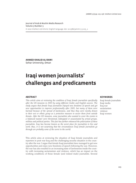 "This article aims at reviewing the condition of Iraqi female journalists specifically after the US invasion in 2003 by using different Arabic and English sources. The study argues that female Iraqi journalists enjoyed new freedoms of speech and got new opportunities to improve professionally after 2003, but many of them were harmed because of the spread of lawlessness, and thus they were mostly drawn to their sect or ethnic group as a protective measure to secure them from outside threats. After the US invasion, some journalists who wanted to cover the events in a balanced manner were threatened, kidnapped or assassinated by armed groups, militias and political parties. This fact has further enhanced the polarization of these journalists. Iraq has become known as the worst place for journalists to live and work; thus, it is not surprising that the circumstances Iraqi female journalists go through are probably some of the worst in the world." (Abstract)