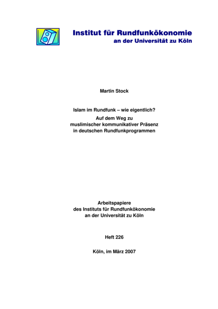 "[...] Vor diesem Hintergrund sei nun der heutige rechtliche Sachstand bei den religiösen Sendungen anhand einiger Gesetzesbeispiele etwas genauer beschrieben (unter 2). Daraus werden sich auch bereits erste Aufschlüsse über künftige allgemeine Entwicklungs- und Reformmöglichkeiten ergeben. Ein entsprechender innovativer Ansatz wird dann kurz umrissen, mit ein paar Seitenblicken auf Islamunterricht in der deutschen öffentlichen Schule als interessante Vergleichsmaterie (unter 3). Nachfolgend geht es um ausgewählte Fragen der Nutzanwendung auf die islamische Religion und deren Präsenz im deutschen Rundfunkwesen, und zwar auch über die Drittsendungen hinaus (unter 4), beginnend vielleicht mit einem redaktionell betreuten „Wort zum Freitag“ (unter 5)." (Einleitung, Seite 8)