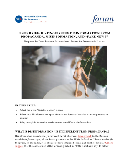 "Disinformation is a relatively new word. Most observers trace it back to the Russian word dezinformatsiya, which Soviet planners in the 1950s defined as “dissemination (in the press, on the radio, etc.) of false reports intended to mislead public opinion.” Others suggest that the earliest use of the term originated in 1930s Nazi Germany. In either case, it is much younger (and less commonly used) than ‘propaganda,’ which originated in the 1600s and generally connotes the selective use of information for political effect. Whether and to what degree these terms overlap is subject to debate. Some define propaganda as the use of non-rational arguments to either advance or undermine a political ideal, and use disinformation as an alternative name for undermining propaganda. Others consider them to be separate concepts altogether. One popular distinction holds that disinformation also describes politically motivated messaging designed explicitly to engender public cynicism, uncertainty, apathy, distrust, and paranoia, all of which disincentivize citizen engagement and mobilization for social or political change. “Misinformation,” meanwhile, generally refers to the inadvertent sharing of false information. Analysts generally agree that disinformation is always purposeful and not necessarily composed of outright lies or fabrications. It can be composed of mostly true facts, stripped of context or blended with falsehoods to support the intended message, and is always part of a larger plan or agenda. In the Russian context, observers have described its use to pursue Moscow’s foreign policy goals through a “4D” offensive: dismiss an opponent’s claims or allegations, distort events to serve political purposes, distract from one’s own activities, and dismay those who might otherwise oppose one’s goals." (Page 1)