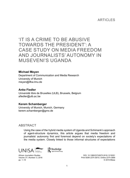 "Using the case of the hybrid media system of Uganda and Schimank’s approach of agent-structure dynamics, this article argues that media freedom and journalists’ autonomy first and foremost depend on society’s expectations of the media system. Closely linked to those informal structures of expectations which are path and time dependent, journalists’ room for manoeuvre is limited by the resources allocated to individual and collective media actors. In a first step and following Schimank’s approach, the article presents a category system that could drive the analysis of media freedom in Uganda and beyond. The empirical study is based on research material consisting of 30 expert interviews, two elite round tables on site in Uganda and documents. This material shows that both journalists’ working conditions and (related to this and even more important) their perception among the ruling elites, public administrations and those governed, limit media freedom. It is precisely the media’s relative societal position which allowed the government to implement a system of media laws and media regulation authorities which creates arbitrariness and, therefore, a feeling of insecurity within the profession." (Abstract)