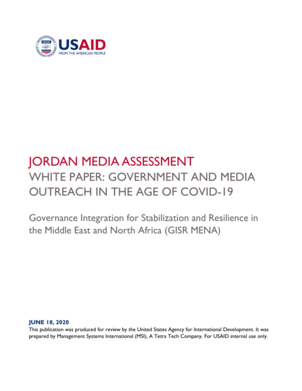 "As a component of the USAID Jordan Media Assessment (JMA), this White Paper aims to assess the Government of Jordan’s (GOJ) and the media’s response to the current COVID-19 crisis starting in mid-February 2020 through May 1, 2020. This includes the methods used for disseminating messages to the public through traditional and digital tools, as well as the means of combating misinformation. In addition, the paper provides an overview of the role of traditional media outlets in shaping public opinion, influencing public behavior, combating rumors and spreading information and facts. Within this short period, independent research, social media discourse, and commentaries by activists and academics indicate that the GOJ’s proactive communications efforts on the COVID-19 crisis are contributing to rebuilding a level of trust between the State and society at large, while increasing transparency." (Page 2)
