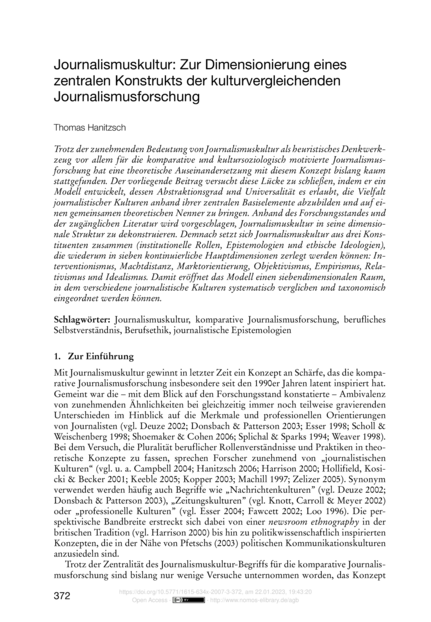 "Trotz der zunehmenden Bedeutung von Journalismuskultur als heuristisches Denkwerkzeug vor allem für die komparative und kultursoziologisch motivierte Journalismusforschung hat eine theoretische Auseinandersetzung mit diesem Konzept bislang kaum stattgefunden. Der vorliegende Beitrag versucht diese Lücke zu schließen, indem er ein Modell entwickelt, dessen Abstraktionsgrad und Universalität es erlaubt, die Vielfalt journalistischer Kulturen anhand ihrer zentralen Basiselemente abzubilden und auf einem gemeinsamen theoretischen Nenner zu bringen. Anhand des Forschungsstandes und der zugänglichen Literatur wird vorgeschlagen, Journalismuskultur in seine dimensionale Struktur zu dekonstruieren. Demnach setzt sich Journalismuskultur aus drei Konstituenten zusammen (Institutionelle Rollen, Epistemologien und Ethische Ideologien), die wiederum in sieben kontinuierliche Hauptdimensionen zerlegt werden können: Interventionismus, Machtdistanz, Marktorientierung, Objektivismus, Empirismus, Relativismus und Idealismus. Damit eröffnet das Modell einen siebendimensionalen Raum, in dem verschiedene journalistische Kulturen systematisch verglichen und taxonomisch eingeordnet werden können." (Zusammenfassung)