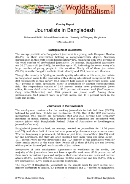 "While answering questions about their professional roles, journalists in Bangladesh preferred being assertive with social issues. An overwhelming majority of the Bangladeshi journalists work to promote tolerance and cultural diversity (87.0%). They also put importance on advocacy for social change (79.6%), followed by letting people express their views (78.8%), providing analysis of current affairs (78.4%) and reporting things as they are (76.8%). They also prioritize political assertiveness by assigning importance and extreme importance to supporting national development (76.3%) and monitoring and scrutinizing political leaders (63.2%). Journalists, however, show the least interest in supporting government policies (28.7%). They ranked roles like being an adversary of the government (28.9%) or conveying a positive image of political leadership (37.3%) the lowest. The journalists in general aim to provide the kind of news that attracts the largest audience (75.9%)." (Journalistic roles, page 2)