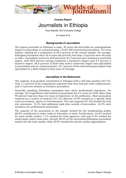 "With regards to professional role orientations, Ethiopian journalists found it most important to support national development, promote tolerance and cultural diversity, provide analysis of current affairs, and educate the audience. The relevance of these roles was fairly undisputed among the interviewed journalists as the relatively low standard deviations indicate. The least valued role among the interviewed journalists was to be an adversary of the government (20.2% saying “extremely” or “very important”). On the same note, around half of the respondents found it important to support government policy and convey a positive image of the political leadership. However, these and similar roles triggered relatively high standard deviations, indicating that the journalist population is split on politically inclined roles orientations." (Journalistic roles, page 2)