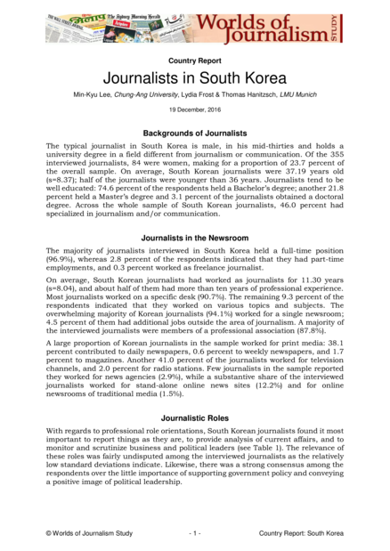 "With regards to professional role orientations, South Korean journalists found it most important to report things as they are, to provide analysis of current affairs, and to monitor and scrutinize business and political leaders. The relevance of these roles was fairly undisputed among the interviewed journalists as the relatively low standard deviations indicate. Likewise, there was a strong consensus among the respondents over the little importance of supporting government policy and conveying a positive image of political leadership. Still, a majority of journalists in South Korea found it important to be a detached observer, to promote tolerance and cultural diversity, to set the political agenda, to provide information people need to make political decisions, to let people express their views, to advocate for social change, and to motivate people to participate in political activity. To provide entertainment and relaxation, as well as politically more assertive roles like supporting government policy and conveying a positive image of political leadership, were supported by only a minority of respondents." (Journalistic roles, pages 1-2)
