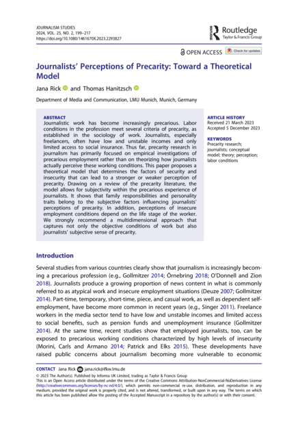 "Journalistic work has become increasingly precarious. Labor conditions in the profession meet several criteria of precarity, as established in the sociology of work. Journalists, especially freelancers, often have low and unstable incomes and only limited access to social insurance. Thus far, precarity research in journalism has primarily focused on empirical investigations of precarious employment rather than on theorizing how journalists actually perceive these working conditions. This paper proposes a theoretical model that determines the factors of security and insecurity that can lead to a stronger or weaker perception of precarity. Drawing on a review of the precarity literature, the model allows for subjectivity within the precarious experience of journalists. It shows that family responsibilities and personality traits belong to the subjective factors influencing journalists’ perceptions of precarity. In addition, perceptions of insecure employment conditions depend on the life stage of the worker. We strongly recommend a multidimensional approach that captures not only the objective conditions of work but also journalists’ subjective sense of precarity." (Abstract)