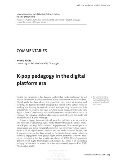 "K-pop pedagogy is an operational term that points to a set of practices and methods of enhancing digital media literacy through the critical analysis of K-pop and its global circulation.1 K-pop is more than a music genre; it has emerged as a global cultural phenomenon that comprises various components, such as digital media, fandom and the media industry. Indeed, the K-pop phenomenon has been reliant on the South Korean music industry’s extensive engagement with global digital media platforms, whereby audiences’ participation has been facilitated. K-pop’s proactive deployment of digital technologies and literacies has made it an interesting pedagogical resource, as shown in a few experimental projects. The K-pop phenomenon as a global and digital wave offers an engaging case for learning and teaching how transnational cultural content is circulated through digital platforms while reaching out to global audiences. The global–local conjunction through digital platforms has enabled viral and global flows of K-pop. Teaching and learning digital media through the analysis of the K-pop phenomenon contributes to critiquing the western-centric framework of media studies and exploring the meanings of digital media technology as an environment of pedagogy. Furthermore, K-pop pedagogy can help overcome the divide between micro-level cultural analysis (of cultural texts or audiences) and macro-level political economic analysis." Pages 183-184)