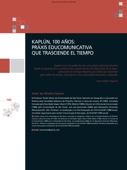 "El presente estudio reúne los elementos esenciales de la ponencia presentada por el autor en la sesión de clausura del seminario celebrativo de los 100 años de nacimiento de Mario Kaplún, realizado de forma virtual, a partir de una articulación de instituciones académicas, investigativas y asociativas latinoamericanas, desde La Paz, Bolivia y Quito, Ecuador, entre 30 y 31 de agosto de 2023. El artículo propone, al inicio, un recorrido por eventos y actividades que marcaron los últimos años de Mario Kaplún, entre 1996 y 1998. Luego, recuerda hechos que permiten identificar el aprecio por el escritor y activista, por parte de latinoamericanos y europeos, durante las dos décadas posteriores a la su muerte. El texto esclarece cómo la teoría del comunicador popular facilita la articulación entre la “comunicación comunitaria” y la “práctica educomunicativa”, tanto en pequeñas comunidades locales como en acciones de gran escala. Agrega, al final, a modo de ejemplo, los resultados de un estudio realizado en Brasil, que demuestra cómo la educomunicación kapluniana logró garantizar - a través de una comunicación dialógica y participativa - la eficacia, coherencia y amplitud de la acción comunicativa del Movimiento de los Trabajadores Rurales Sin Tierra (MST), implementado, en las últimas décadas, en Brasil, integrando 400.000 familias distribuidas en el vasto territorio geográfico del país." (Resumen)