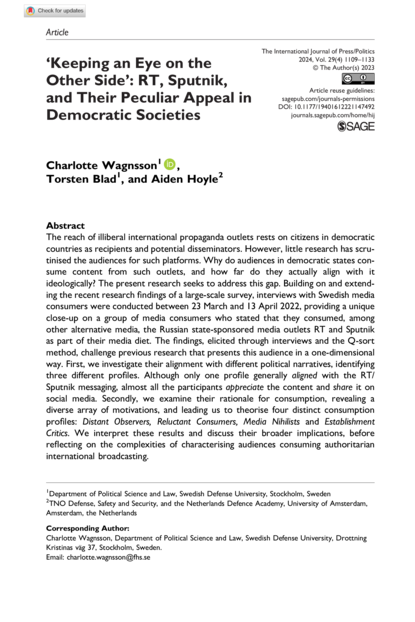"The reach of illiberal international propaganda outlets rests on citizens in democratic countries as recipients and potential disseminators. However, little research has scrutinised the audiences for such platforms. Why do audiences in democratic states consume content from such outlets, and how far do they actually align with it ideologically? The present research seeks to address this gap. Building on and extending the recent research findings of a large-scale survey, interviews with Swedish media consumers were conducted between 23 March and 13 April 2022, providing a unique close-up on a group of media consumers who stated that they consumed, among other alternative media, the Russian state-sponsored media outlets RT and Sputnik as part of their media diet. The findings, elicited through interviews and the Q-sort method, challenge previous research that presents this audience in a one-dimensional way. First, we investigate their alignment with different political narratives, identifying three different profiles. Although only one profile generally aligned with the RT/ Sputnik messaging, almost all the participants appreciate the content and share it on social media. Secondly, we examine their rationale for consumption, revealing a diverse array of motivations, and leading us to theorise four distinct consumption profiles: Distant Observers, Reluctant Consumers, Media Nihilists and Establishment Critics. We interpret these results and discuss their broader implications, before reflecting on the complexities of characterising audiences consuming authoritarian international broadcasting." (Abstract)