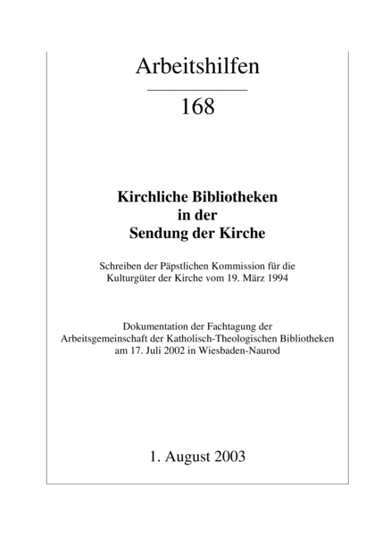 Kirchliche Bibliotheken in der Sendung der Kirche: Schreiben der Päpstlichen Kommission für die Kulturgüter der Kirche vom 19. März 1994. Dokumentation der Fachtagung der Arbeitsgemeinschaft der Katholisch-Theologischen Bibliotheken am 17. Juli in Wiesbaden-Naurod