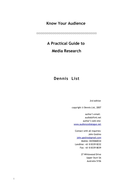 "The first six chapters of this book give you the background information you need to understand how to do an audience survey to a high standard. The explanation is based on the standard face-to-face survey method, where trained interviewers speak directly to audience members. You can use the information in Part I in several ways: to organize your own survey, or to commission an expert to do a survey for you, and understand most of the decisions that they and you will face, or to help decide whether you need a survey, or some other type of research. If you are interested doing your own research, but after reading these six chapters you realize that it may be too difficult, slow, or expensive to complete a face-to-face survey, try Part II of the book, which describes some other types of survey, and several methods of qualitative research." (Page 5)