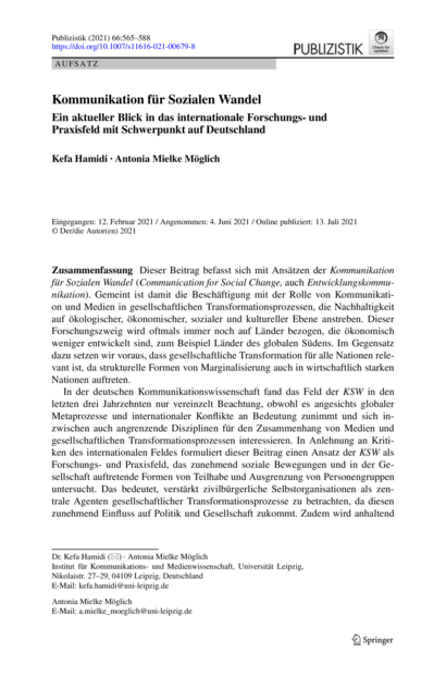 "Dieser Beitrag befasst sich mit Ansätzen der Kommunikation für Sozialen Wandel (Communication for Social Change, auch Entwicklungskommunikation). Gemeint ist damit die Beschäftigung mit der Rolle von Kommunikation und Medien in gesellschaftlichen Transformationsprozessen, die Nachhaltigkeit auf ökologischer, ökonomischer, sozialer und kultureller Ebene anstreben. Dieser Forschungszweig wird oftmals immer noch auf Länder bezogen, die ökonomisch weniger entwickelt sind, zum Beispiel Länder des globalen Südens. Im Gegensatz dazu setzen wir voraus, dass gesellschaftliche Transformation für alle Nationen relevant ist, da strukturelle Formen von Marginalisierung auch in wirtschaftlich starken Nationen auftreten. In der deutschen Kommunikationswissenschaft fand das Feld der KSW in den letzten drei Jahrzehnten nur vereinzelt Beachtung, obwohl es angesichts globaler Metaprozesse und internationaler Konflikte an Bedeutung zunimmt und sich inzwischen auch angrenzende Disziplinen für den Zusammenhang von Medien und gesellschaftlichen Transformationsprozessen interessieren. In Anlehnung an Kritiken des internationalen Feldes formuliert dieser Beitrag einen Ansatz der KSW als Forschungs- und Praxisfeld, das zunehmend soziale Bewegungen und in der Gesellschaft auftretende Formen von Teilhabe und Ausgrenzung von Personengruppen untersucht. Das bedeutet, verstärkt zivilbürgerliche Selbstorganisationen als zentrale Agenten gesellschaftlicher Transformationsprozesse zu betrachten, da diesen zunehmend Einfluss auf Politik und Gesellschaft zukommt. Zudem wird anhaltend gefordert, die Menschen, über die geforscht wird, in den Forschungsprozess einzubeziehen. Die Idee der partizipativen Forschung liegt auch diesem Beitrag zugrunde. Abschließend plädieren wir sowohl für mehr empirische Forschungen als auch für die Etablierung eines Studienganges zu KSW in Deutschland." (Zusammenfassung)